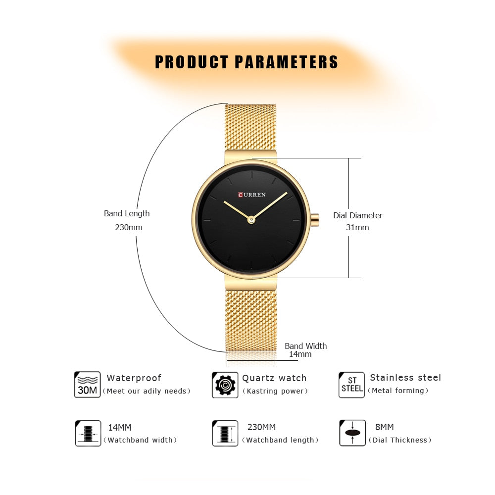 CURREN 9016 მოდური ლურჯი ქალის საათი, ბადისებრი უჟანგავი ფოლადის კვარცის საათი, ქალის ფუფუნების მარტივი მაჯის საათი, ანალოგური ქალის საათი