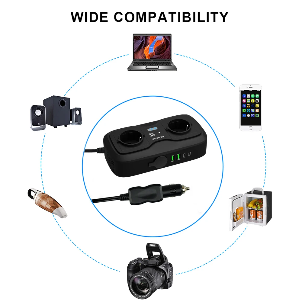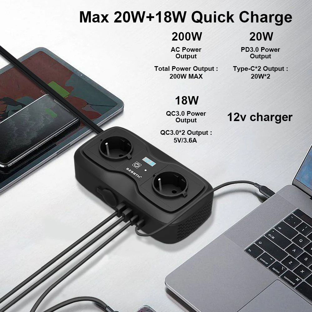 ინვერტორი 200W - Dc 12v-დან AC 220v-მდე ავტომობილის დენის ინვერტორი USB სოკეტებით