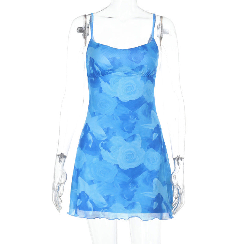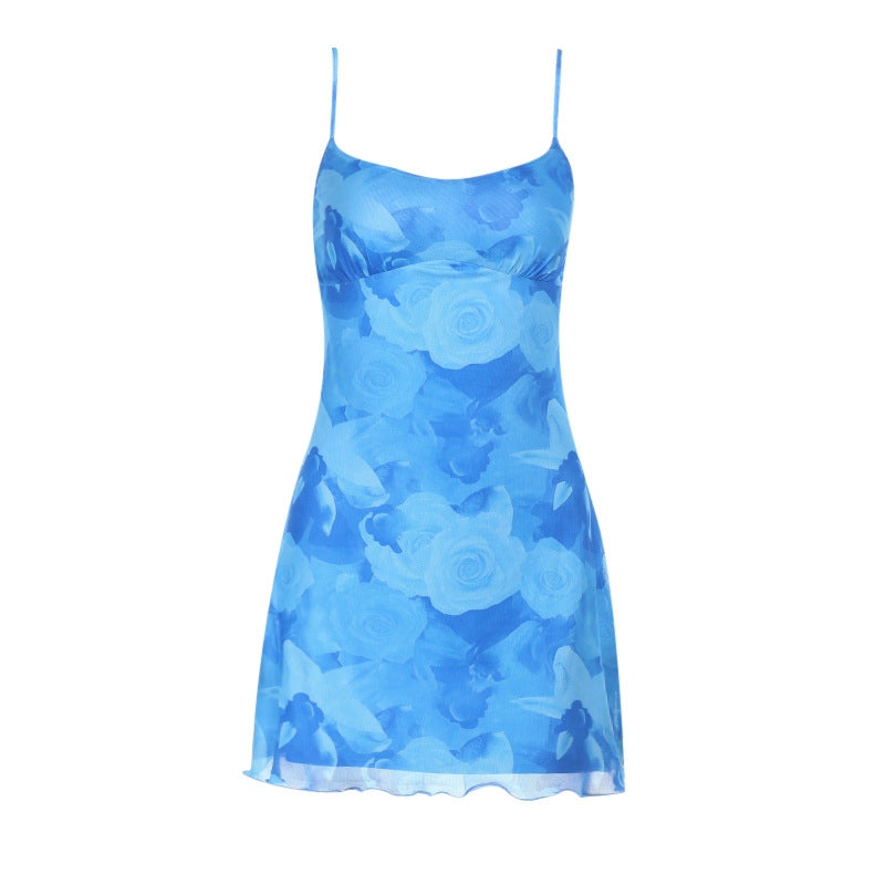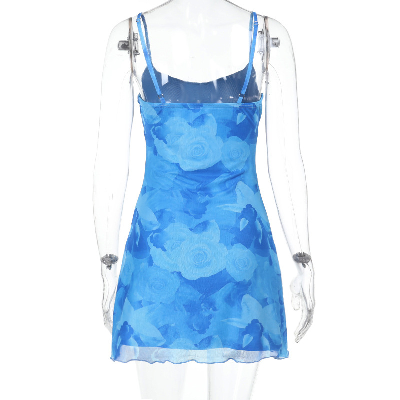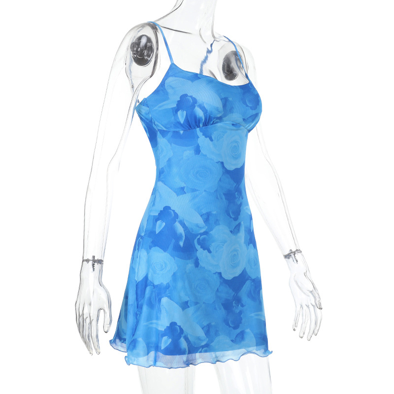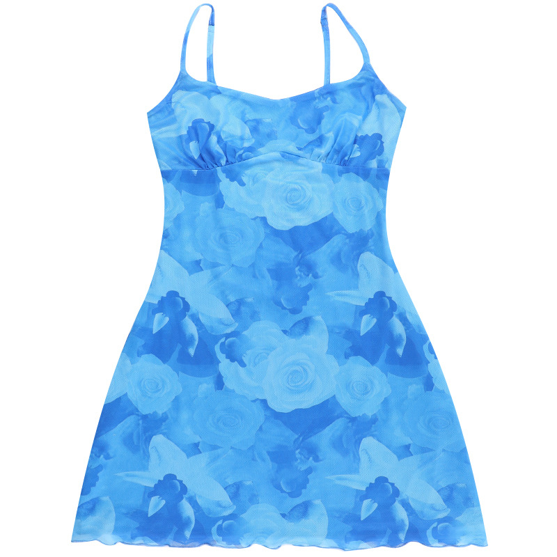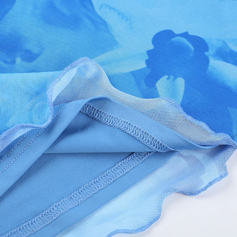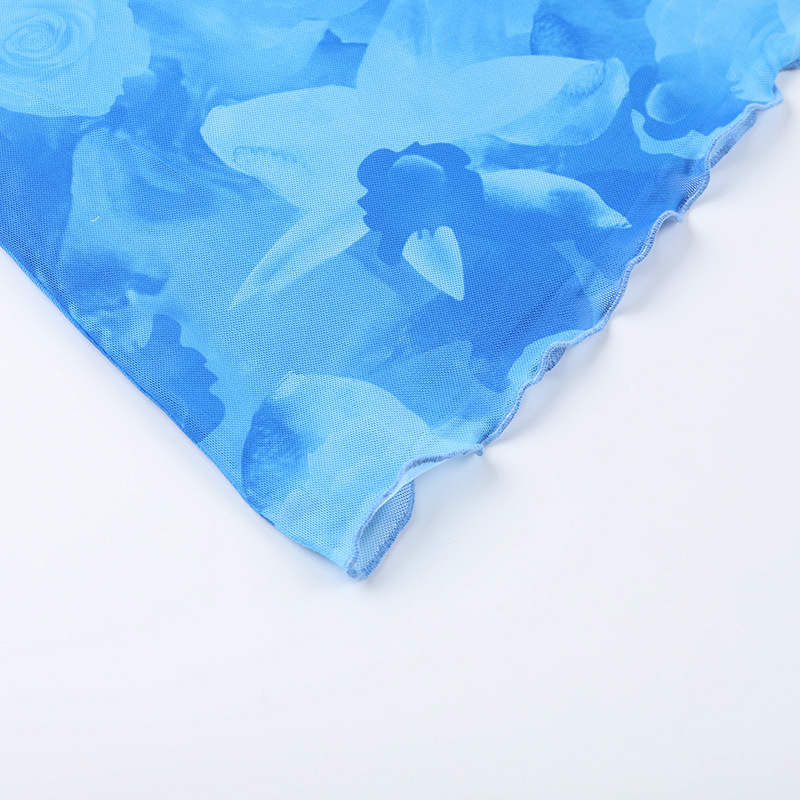 ბადისებრი პრინტიანი საკიდარით გაფორმებული წელის ჩანთა და თეძოს კაბა